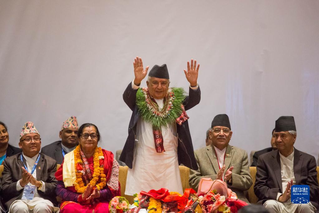 3月9日,在尼泊爾加德滿都,尼泊爾大會(huì)黨領(lǐng)導(dǎo)人拉姆·錢德拉·保德爾(中)在總統(tǒng)選舉勝出后揮手致意。新華社發(fā)(蘇拉韋·什雷斯塔攝)