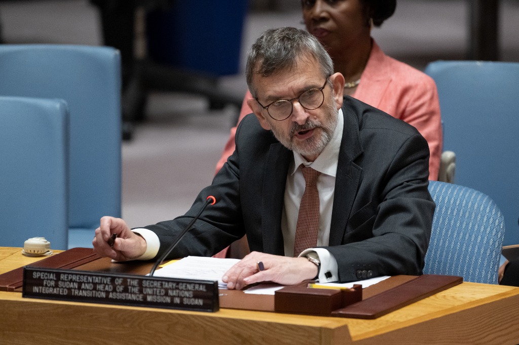 5月22日,在紐約聯(lián)合國(guó)總部,聯(lián)合國(guó)秘書長(zhǎng)蘇丹問(wèn)題特別代表福爾克·佩爾特斯在安理會(huì)審議蘇丹問(wèn)題時(shí)發(fā)言。新華社發(fā)(聯(lián)合國(guó)供圖/埃瑟金德?tīng)枴さ仑惒窋z)