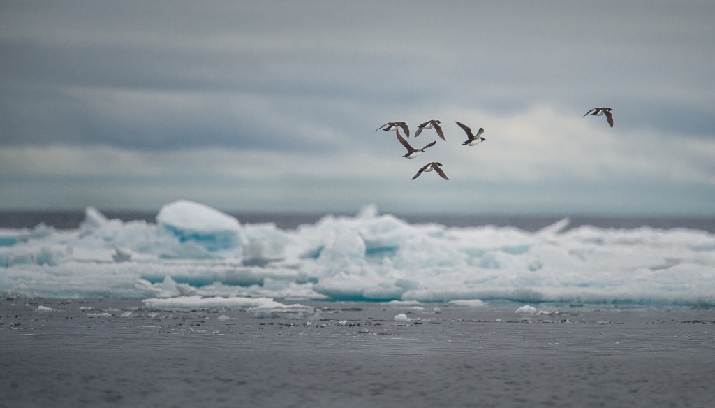 2014年7月2日,一群海鳥在北冰洋海域浮冰上空飛過。新華社記者戴天放攝