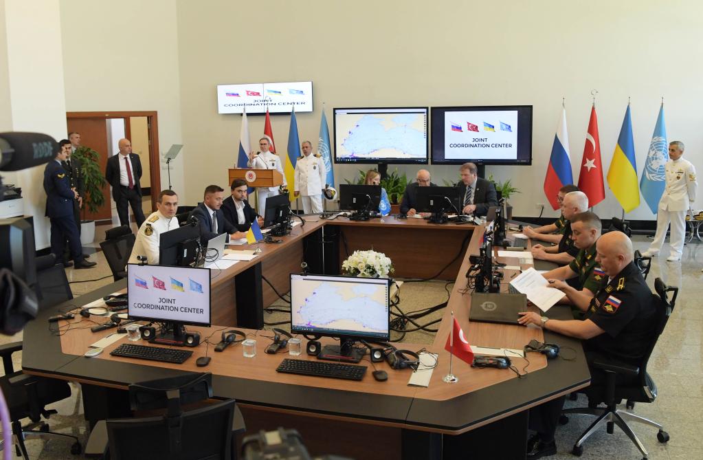 這是2022年7月27日在土耳其伊斯坦布爾拍攝的黑海糧食外運(yùn)聯(lián)合協(xié)調(diào)中心。土耳其、俄羅斯、烏克蘭和聯(lián)合國(guó)代表27日在土耳其最大城市伊斯坦布爾的土耳其國(guó)防大學(xué)舉行黑海糧食外運(yùn)聯(lián)合協(xié)調(diào)中心正式運(yùn)行儀式。新華社記者 沙達(dá)提 攝
