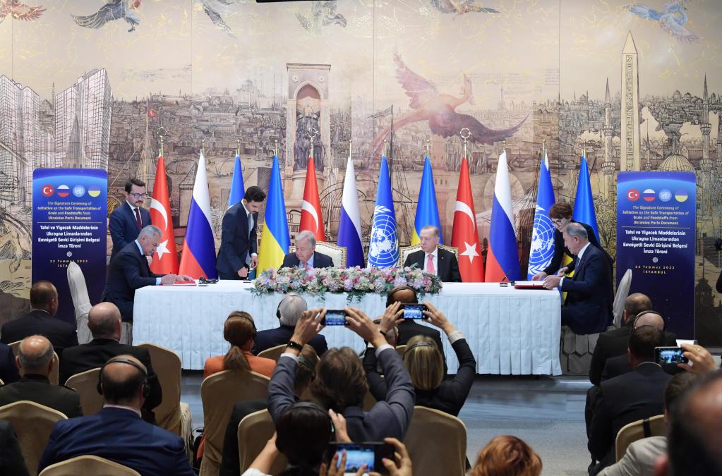 2022年7月22日,在土耳其伊斯坦布爾多爾瑪巴赫切宮,土耳其國(guó)防部長(zhǎng)阿卡爾(右)、聯(lián)合國(guó)秘書長(zhǎng)古特雷斯(中左)與俄羅斯國(guó)防部長(zhǎng)紹伊古(左)在簽署協(xié)議。當(dāng)日,土耳其、俄羅斯、烏克蘭和聯(lián)合國(guó)代表在土耳其最大城市伊斯坦布爾就從黑海港口外運(yùn)農(nóng)產(chǎn)品問題舉行簽署協(xié)議儀式。新華社記者 沙達(dá)提 攝