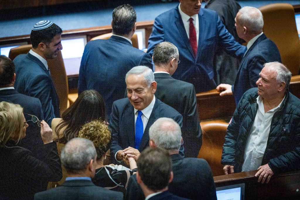 2022年12月29日,內(nèi)塔尼亞胡(中)在耶路撒冷出席以色列議會會議。新華社/基尼圖片社