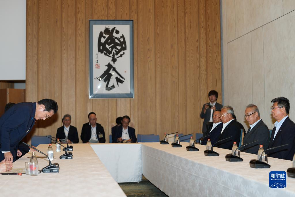 8月21日,在日本東京首相官邸,日本全國漁業(yè)協(xié)會聯(lián)合會會長坂本雅信(右二)在與日本首相岸田文雄會見時發(fā)言。新華社記者 張笑宇 攝