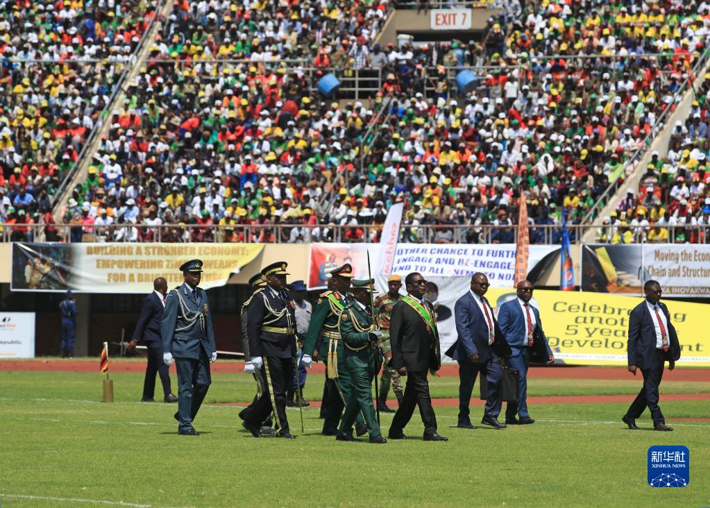 9月4日,在津巴布韋首都哈拉雷的國家體育場,津巴布韋當(dāng)選總統(tǒng)姆南加古瓦(右四)在就職典禮上檢閱儀仗隊。新華社發(fā)(肖恩·朱薩攝)