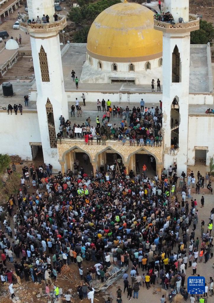 9月18日,市民在利比亞德爾納清真寺前集會,呼吁大家團結(jié)起來。新華社發(fā)(胡沙姆·圖爾基亞攝)