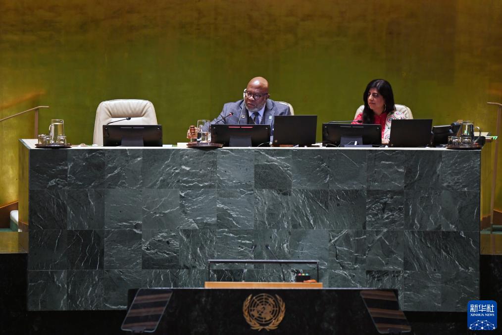 9月26日,在位于紐約的聯(lián)合國(guó)總部,第78屆聯(lián)大主席弗朗西斯(左)宣布聯(lián)合國(guó)大會(huì)一般性辯論閉幕。 新華社記者李睿攝