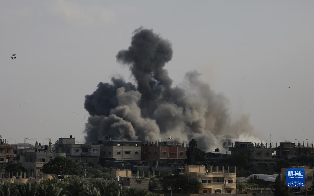 10月10日,在加沙地帶南部城市拉法,以色列空襲后升起濃煙。新華社發(fā)(哈立德·奧馬爾攝)