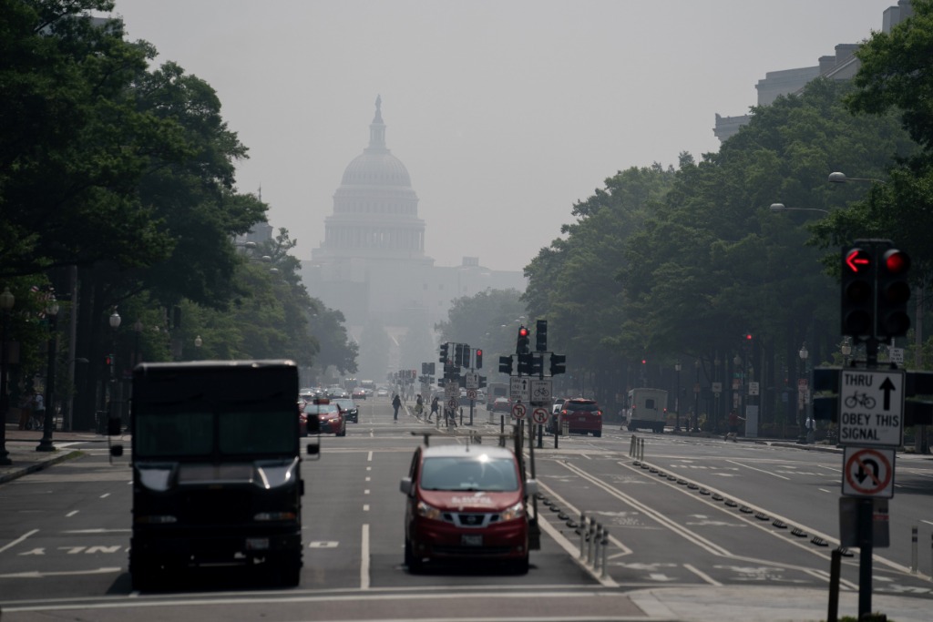 6月29日,在美國首都華盛頓,國會大廈籠罩在煙霧中。新華社記者劉杰攝