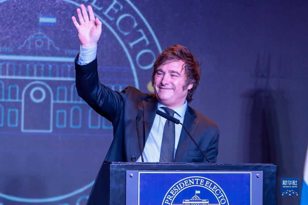 11月19日,阿根廷極右翼選舉聯(lián)盟“自由前進黨”候選人米萊在首都布宜諾斯艾利斯的競選總部外向民眾致意。新華社發(fā)(盧西亞諾·托雷斯攝)