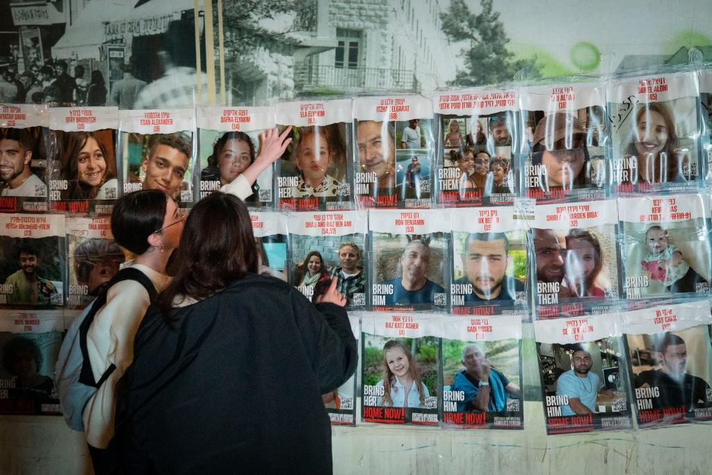 11月27日,在耶路撒冷,人們查看被扣押人員海報(bào)。新華社記者陳君清攝