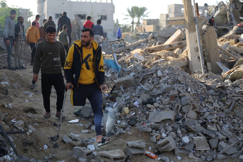 12月4日,在加沙地帶南部城市拉法,人們查看以軍空襲后的住宅廢墟。新華社發(fā)(哈立德·奧馬爾攝)