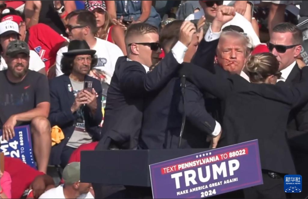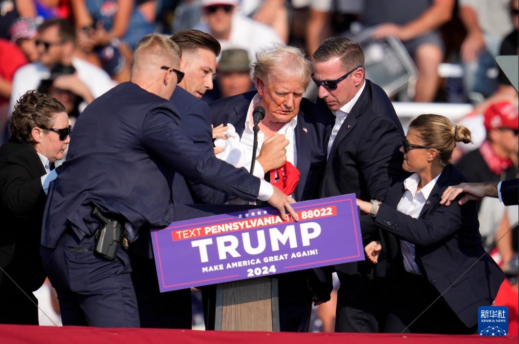 7月13日,美國(guó)前總統(tǒng)特朗普在賓夕法尼亞州巴特勒市的競(jìng)選集會(huì)現(xiàn)場(chǎng)被護(hù)送離開。新華社/美聯(lián)