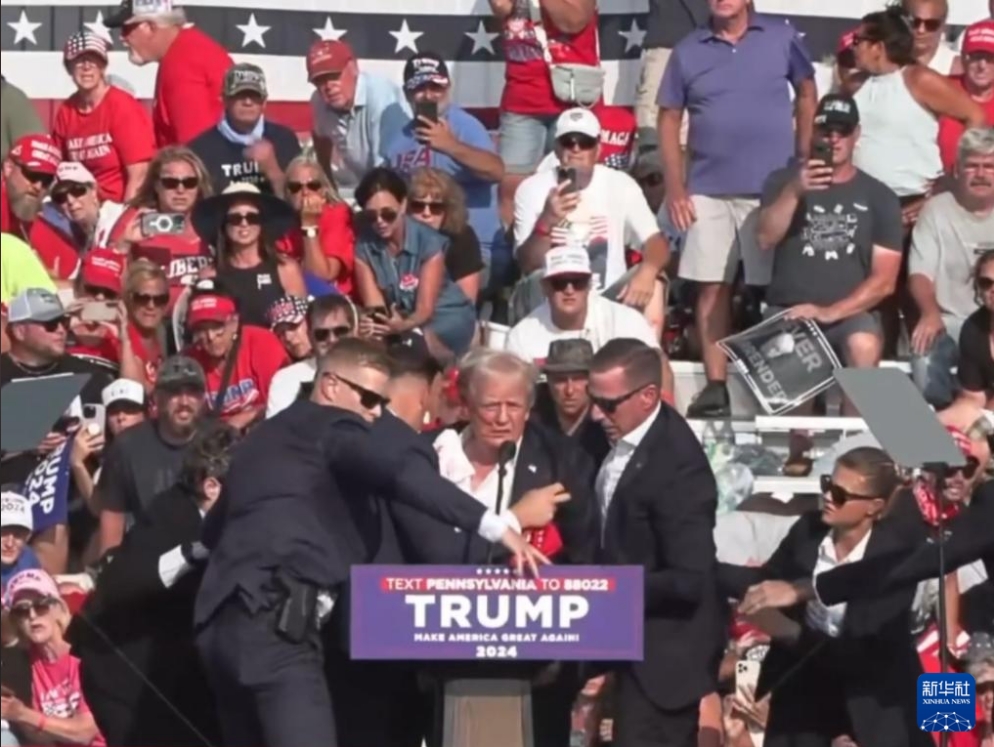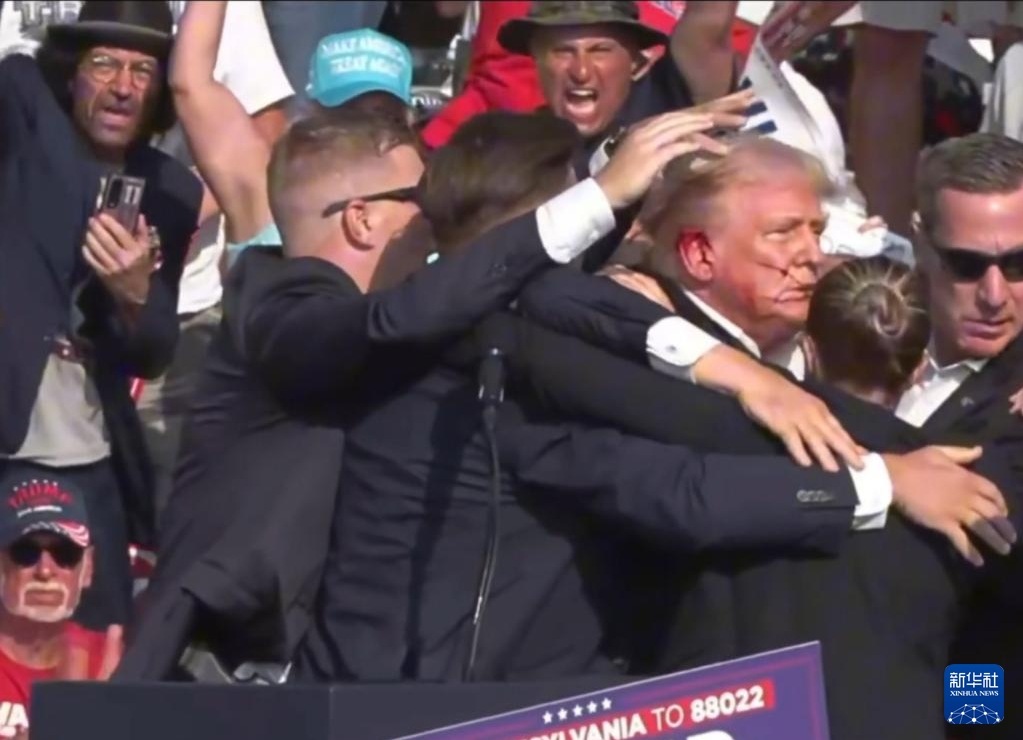 這張視頻截圖顯示,7月13日,美國(guó)前總統(tǒng)特朗普在賓夕法尼亞州巴特勒市的競(jìng)選集會(huì)現(xiàn)場(chǎng)被護(hù)送離開。新華社發(fā)
