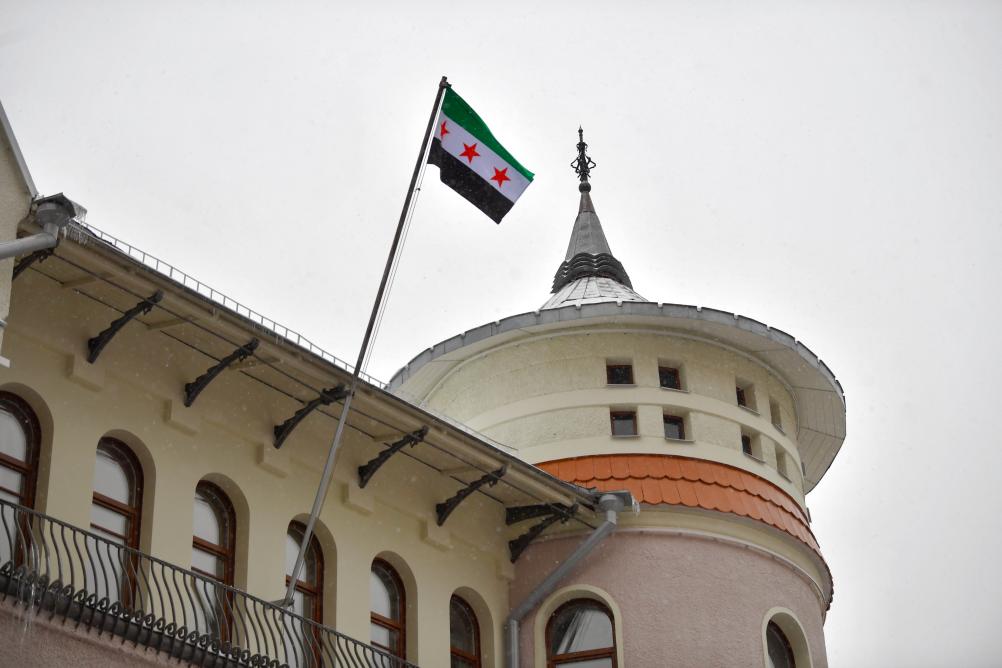 12月9日,在俄羅斯首都莫斯科,敘利亞駐俄羅斯使館升起代表敘利亞反對(duì)派的旗幟。新華社發(fā)(亞歷山大攝)