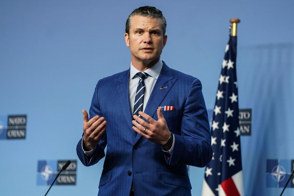 2月13日,在比利時布魯塞爾,美國國防部長赫格塞思在發(fā)布會上講話。新華社記者彭子洋攝