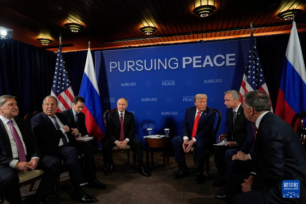 當(dāng)?shù)貢r(shí)間8月15日11時(shí)20分許,美國(guó)總統(tǒng)特朗普(右三)和俄羅斯總統(tǒng)普京(左四)在美國(guó)阿拉斯加州安克雷奇市埃爾門(mén)多夫-理查森聯(lián)合軍事基地正式開(kāi)始會(huì)晤。新華社/美聯(lián)