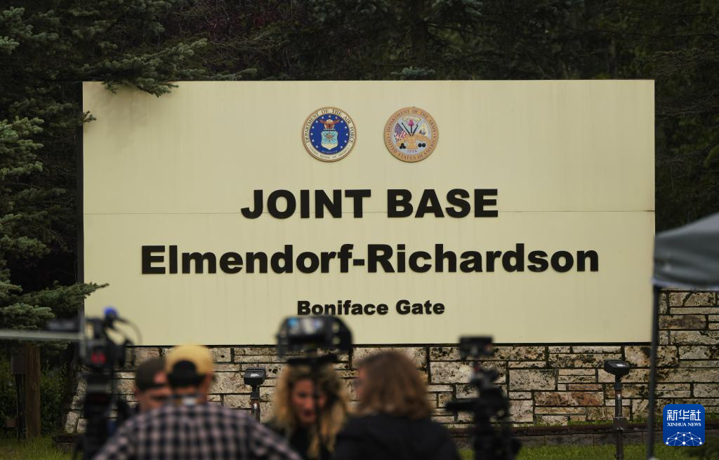 8月14日,媒體記者在美國(guó)阿拉斯加州安克雷奇的埃爾門(mén)多夫-理查森聯(lián)合軍事基地外報(bào)道。新華社記者吳曉凌攝