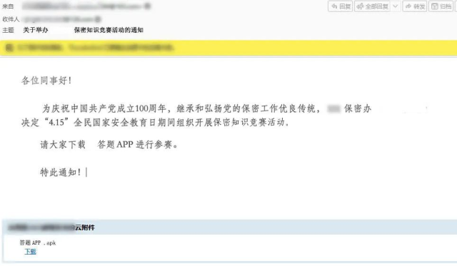 夏日炎炎,蟬鳴聒噪,南方的夏天格外濕熱,坐在辦公室的小張被空調(diào)的冷氣圍裹著,忽感一絲寒意。就在他準備伸個懶腰之時,“叮咚”,單位群聊天窗口收到了新消息,通知大家參加保密知識競賽,并要求下載安裝某手機應用程序。與此同時,小張的工作郵箱也收到了一封陌生郵件。