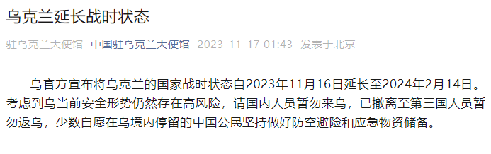 北京時(shí)間11月17日,中國駐烏克蘭大使館就烏克蘭延長戰(zhàn)時(shí)狀態(tài)發(fā)布通告。