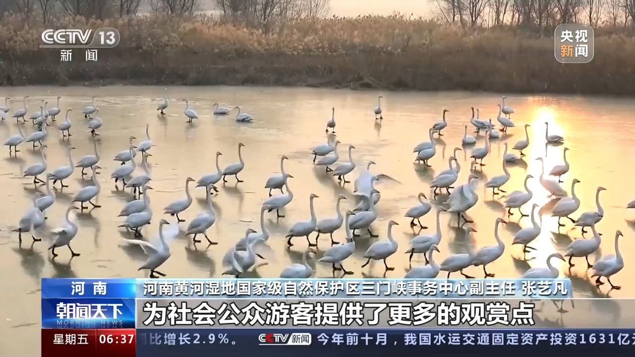 河南黃河濕地國(guó)家級(jí)自然保護(hù)區(qū)三門(mén)峽事務(wù)中心副主任 張藝凡:白天鵝棲息地也有所增加,由之前的四處增加到現(xiàn)在的九處,為社會(huì)公眾、游客提供了更多的觀賞點(diǎn)。