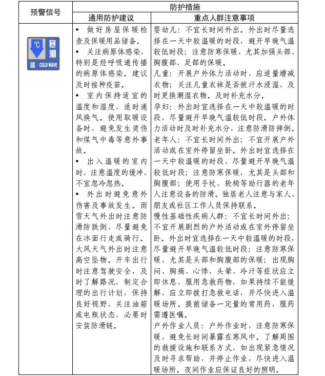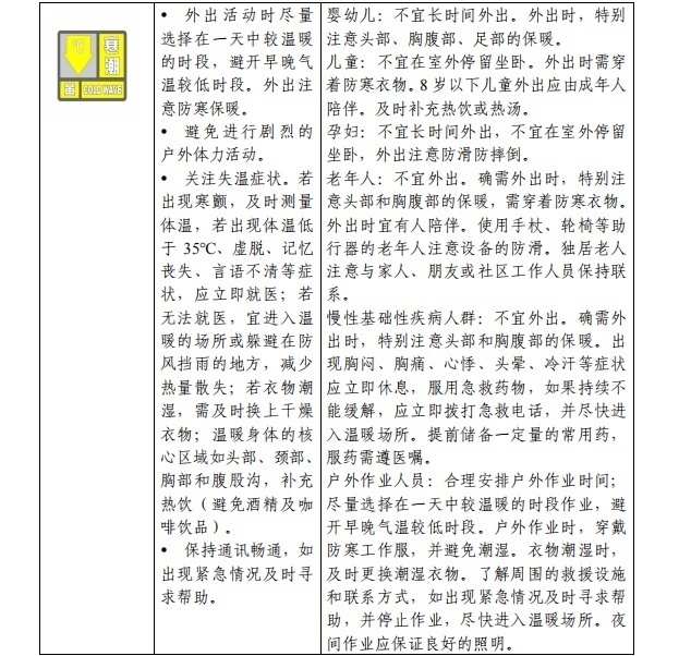 針對寒潮預(yù)警信號等級,我們提出分級人群防護(hù)措施建議。
