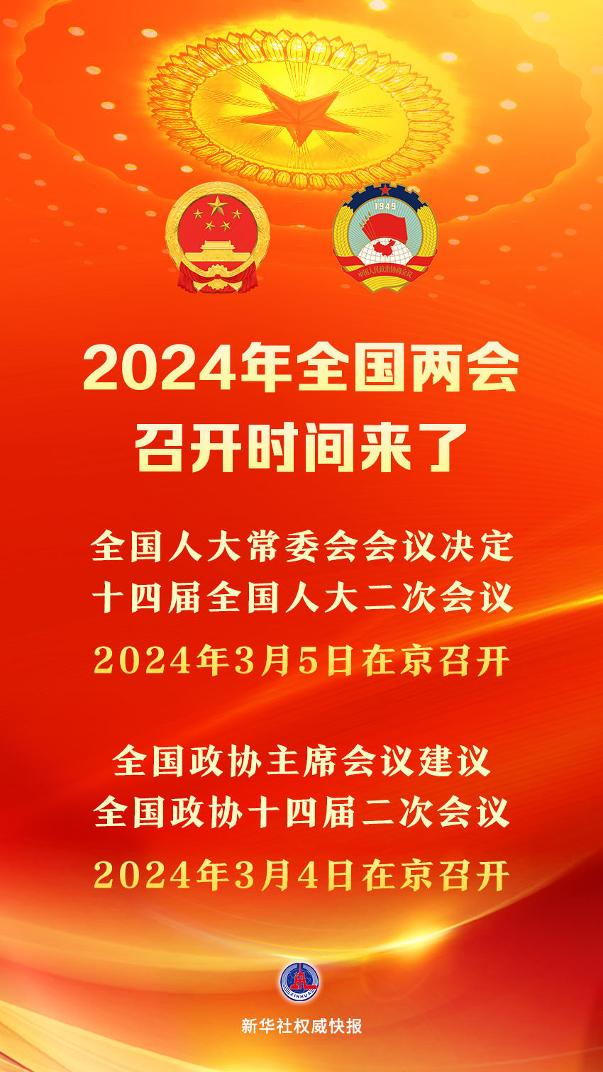 新華社北京12月29日電 十四屆全國人大常委會第七次會議29日表決通過了關(guān)于召開十四屆全國人大二次會議的決定。根據(jù)決定,十四屆全國人大二次會議將于2024年3月5日在北京召開。