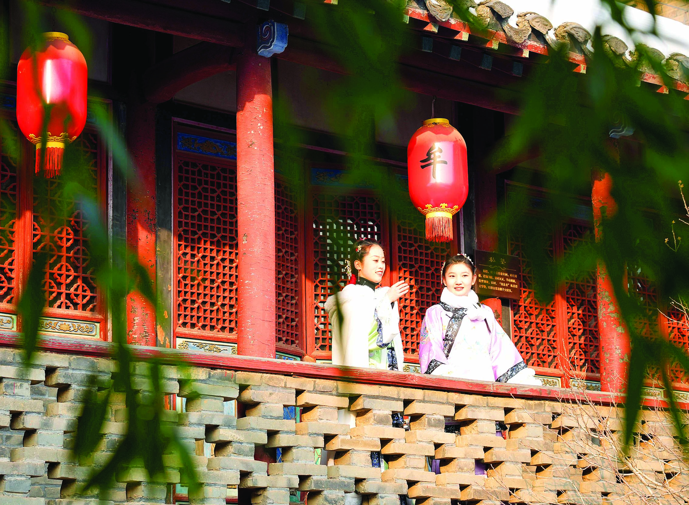 棲霞市牟氏莊園,穿復(fù)古裝的女孩在庭院里竊竊私語。