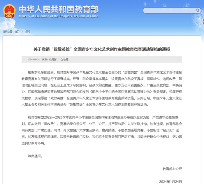 南方網(wǎng)訊 (記者/倪仕軒)1月24日,教育部網(wǎng)站發(fā)布關(guān)于撤銷“致敬英雄”全國(guó)青少年文化藝術(shù)創(chuàng)作主題教育競(jìng)賽活動(dòng)資格的通報(bào),全文如下: