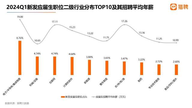 報告顯示,一季度新發(fā)應(yīng)屆生職位行業(yè)分布TOP10中,電子/半導(dǎo)體/集成電路排名第一,占比8.76%;機(jī)械/設(shè)備、互聯(lián)網(wǎng)以4.74%的占比并列第二;計算機(jī)軟件、新能源排名第四至第五。從這TOP10行業(yè)的應(yīng)屆生招聘平均年薪來看,電子/半導(dǎo)體/集成電路以19萬元領(lǐng)先。