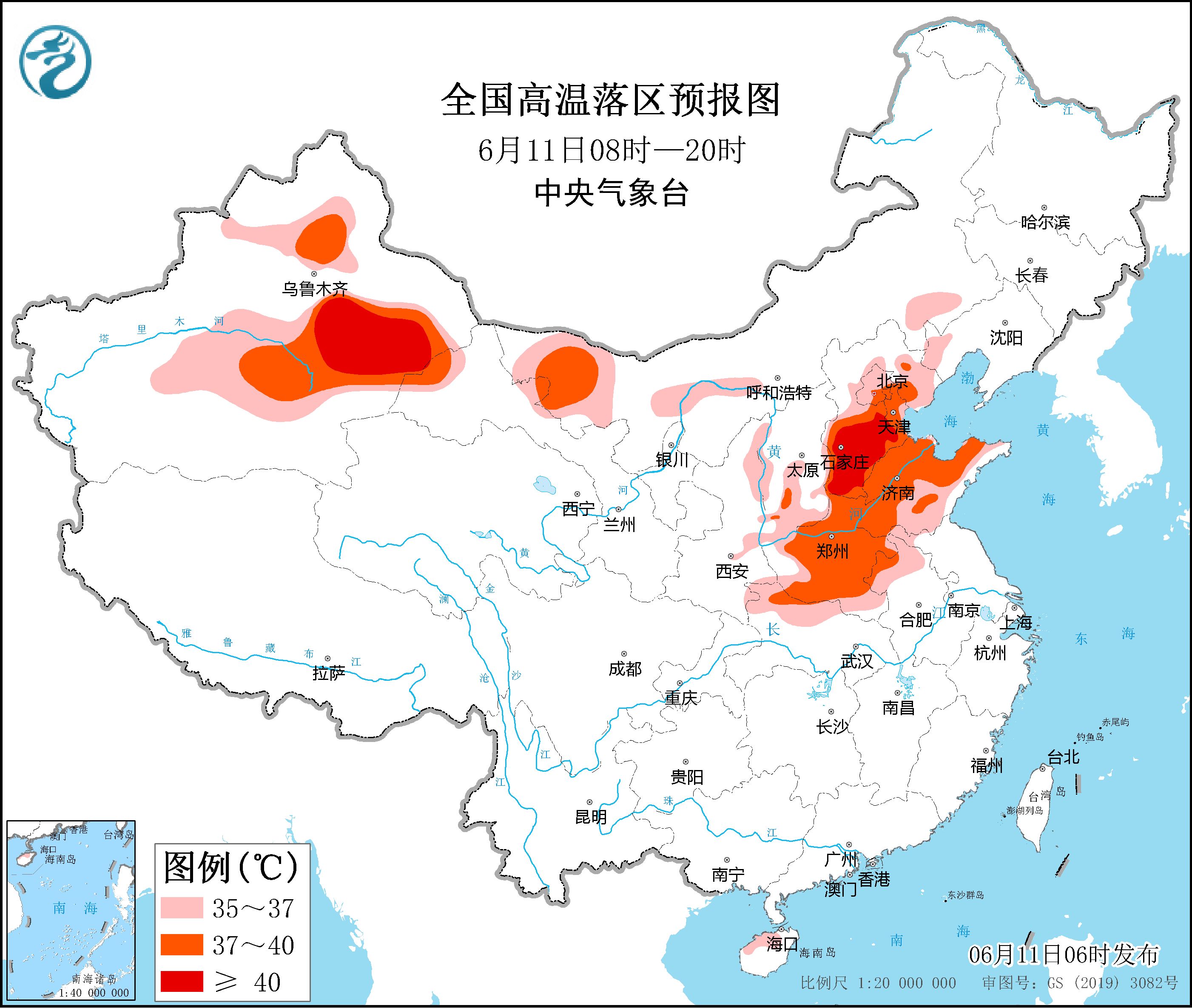 預(yù)計6月11日白天,河北中南部和東北部、北京、天津、山東、河南、安徽北部、湖北北部、山西南部、內(nèi)蒙古西部和東南部、新疆北疆盆地和南疆盆地、海南島西北部等地有35℃以上高溫天氣,其中,河北中南部、北京東南部、天津、山東中北部、河南大部、內(nèi)蒙古西北部、新疆南疆盆地東部等地最高氣溫37~39℃,河北中南部、新疆南疆盆地等地部分地區(qū)可達(dá)40℃以上。