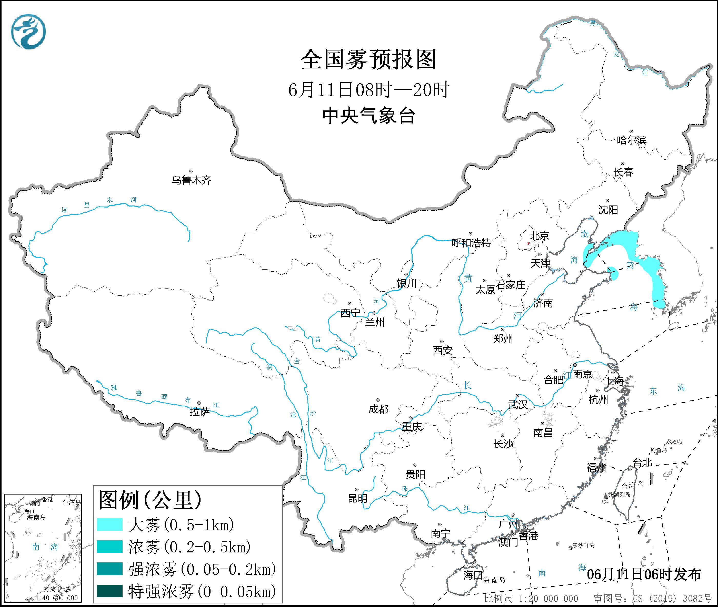 預(yù)計,6月11日白天,渤海海峽、黃海北部及中東部部分海域、遼東半島沿岸海域、成山頭附近海域?qū)⒂心芤姸炔蛔?公里的大霧。