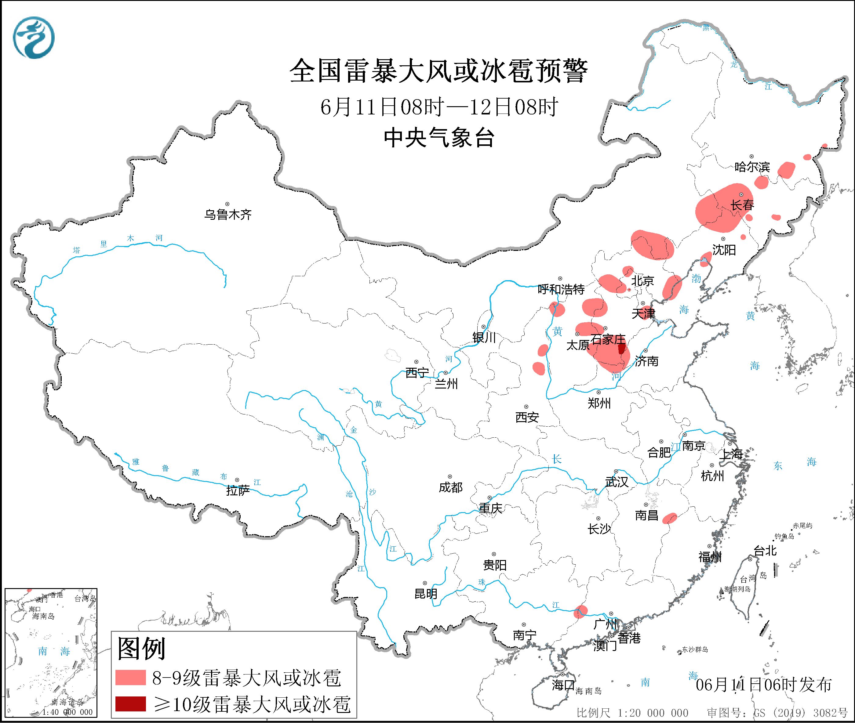 預(yù)計6月11日8時至12日8時,內(nèi)蒙古東南部、黑龍江東南部、吉林中部、遼寧北部、陜西北部、山西中北部、河北西部和南部、北京西部、天津南部等地的部分地區(qū)將有8級以上雷暴大風(fēng)或冰雹天氣,其中,河北南部的部分地區(qū)將有10級以上雷暴大風(fēng),最大風(fēng)力可達(dá)11級以上;黑龍江東南部、吉林中部、遼寧北部、天津南部、湖南南部、江西中部、浙江中南部、福建東部和西北部、四川南部、貴州中西部和南部、云南東部和西南部、廣西東部和西北部、廣東中東部和西北部、海南島東北部等地的部分地區(qū)將有小時雨量大于20毫米的短時強(qiáng)降水天氣,其中,福建西北部部分地區(qū)將有小時雨量大于50毫米,最大可達(dá)70毫米以上。