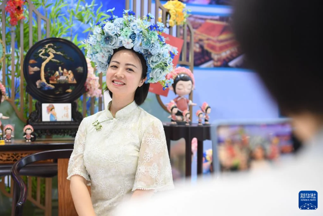 5月23日,參觀者在第二十屆文博會(huì)福建館體驗(yàn)簪花。新華社記者 毛思倩 攝
