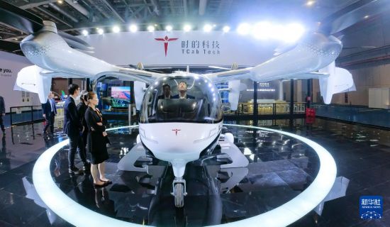 11月5日,參會者在第七屆進(jìn)博會汽車展區(qū)體驗時的科技E20 eVTOL電動垂直起降飛行器。