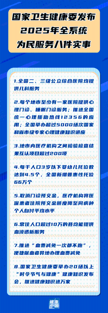 新華社北京12月31日電(記者董瑞豐、李恒)國家衛(wèi)生健康委31日發(fā)布2025年全系統(tǒng)為民服務(wù)八件實(shí)事,包括: