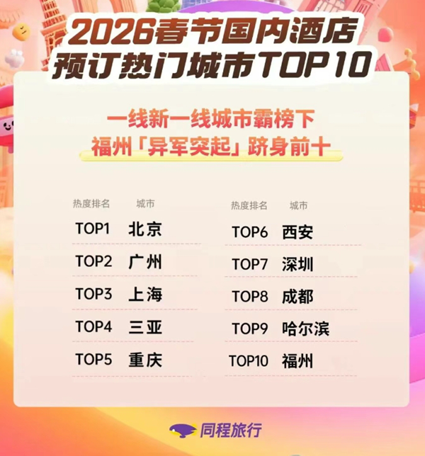 同程旅行數(shù)據(jù)顯示,春節(jié)國內(nèi)酒店預(yù)訂熱門城市TOP10榜單,基本被一線、新一線城市霸榜,但“國家歷史文化名城”福建福州闖出一席之地,躋身第10名。2025年,三坊七巷、煙臺山、上下杭等3個(gè)街區(qū)全年接待游客超5500萬人次,創(chuàng)歷史新高。