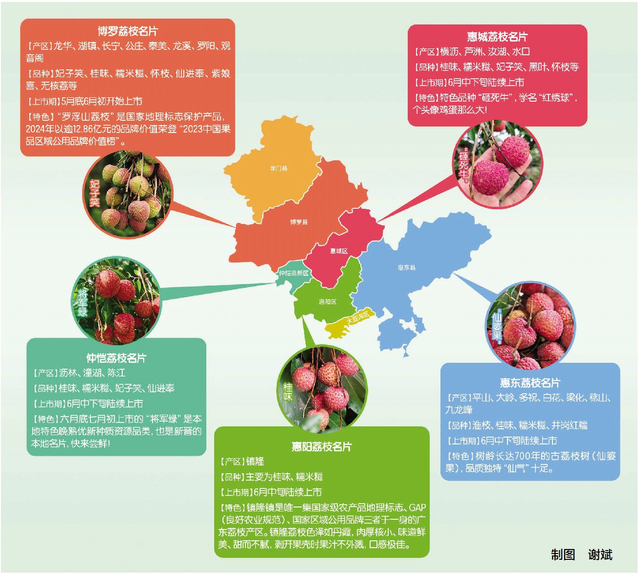 網(wǎng)友可以說是非常識貨了。中國荔枝看廣東,惠州是廣東荔枝的主產(chǎn)地之一。“羅浮山下四時春,盧橘楊梅次第新。日啖荔枝三百顆,不辭長作嶺南人。”惠州荔枝不僅深深烙下東坡印記,而且產(chǎn)區(qū)多、品種豐富,惠城、惠陽、惠東、博羅、仲愷……各縣區(qū)出產(chǎn)的荔枝各具特色,這份由惠州日報記者精心繪制的惠州“荔枝地圖”,帶你開啟一場美“荔”之旅。