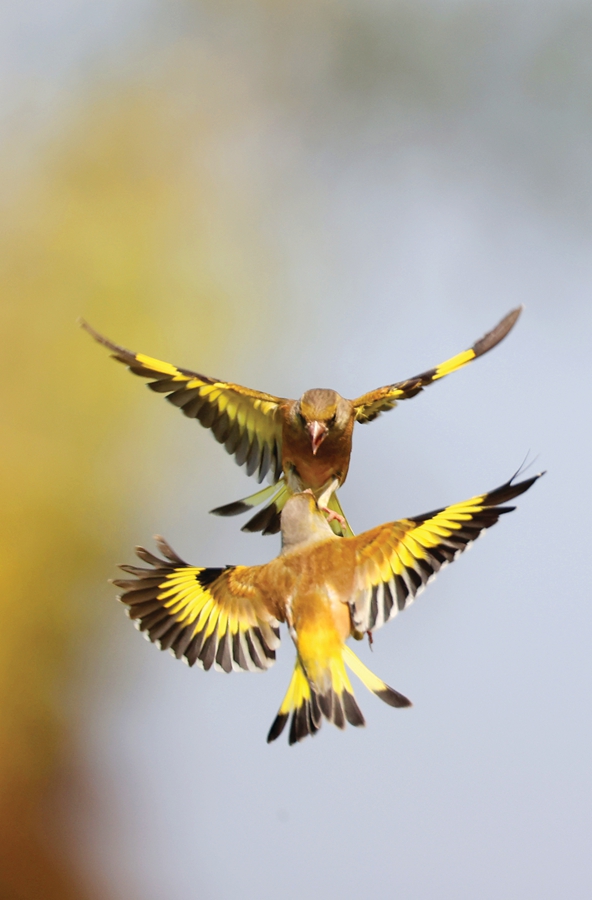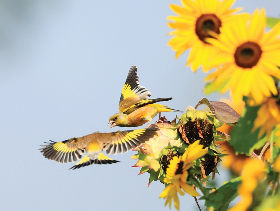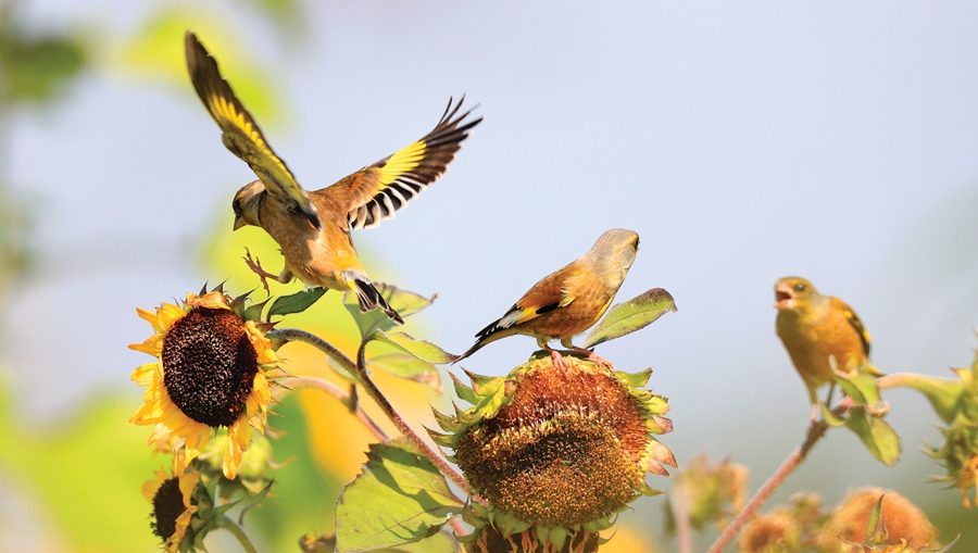 站在葵花上的金翅雀熟練準確地啄下葵花籽,用特有的喙輕松剝去外殼,吃下雪白的瓜子仁,整個動作一氣呵成,非常可愛。金翅雀飛舞時,展開的黃色翅膀非常耀眼,與葵花的黃色交相輝映,繪就一幅幅完美的畫作,更讓葵園充滿了勃勃生機。