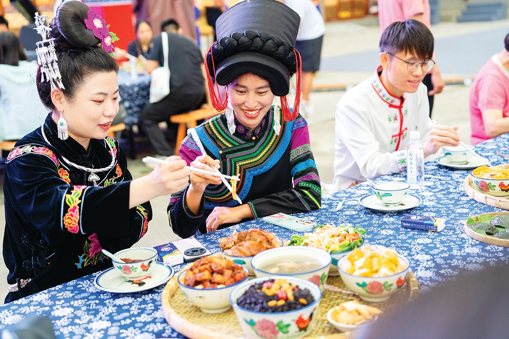 “‘三月三’長桌宴開飯啦!”為了迎接遠(yuǎn)道而來的貴客,此次活動不僅帶來了富有畬族特色的民族歌舞,還準(zhǔn)備了畬族特色長桌宴。一碗碗畬族傳統(tǒng)菜肴擺滿長桌,冒著騰騰熱氣。長桌一旁,象征火紅生活的篝火熊熊燃燒。飯后,畬族同胞與賓朋心手相連,隨著音樂的旋律歡快地舞動起來。當(dāng)天,畬族同胞還帶領(lǐng)游客們齊跳竹竿舞,現(xiàn)場竿聲陣陣、笑聲飄揚。“我們感受到了濃濃的民族風(fēng)情!”游客鄭先生特意與朋友前來體驗畬族風(fēng)情,他第一次參加畬族文化活動便深刻感受到了畬族文化的魅力。
