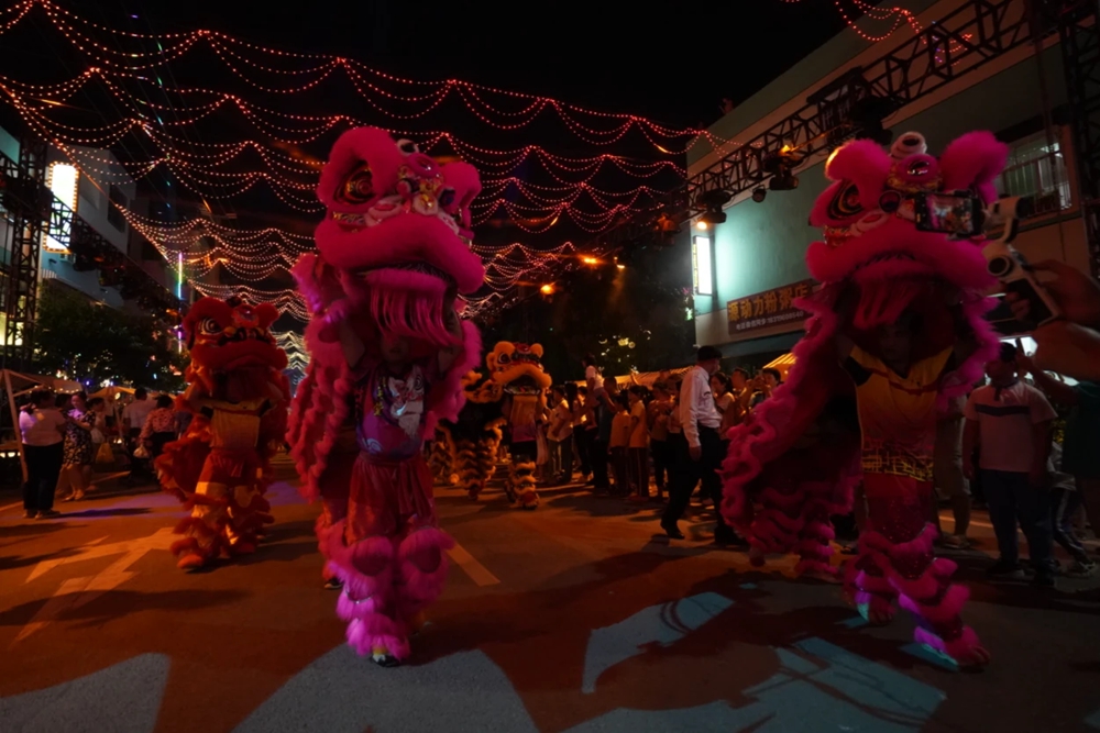 福明美食商業(yè)街揭牌亮燈儀式,非遺龍華大鼓演出。