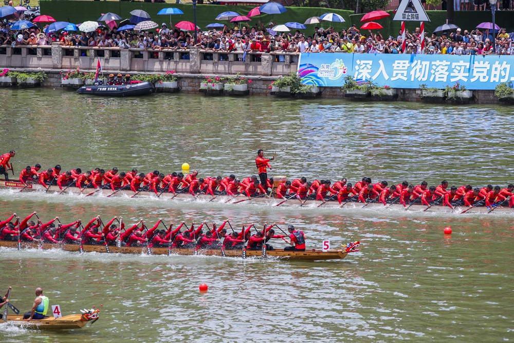 啟動儀式后,激動人心的粵港澳大灣區(qū)(廣東)龍舟邀請賽暨東莞龍舟錦標(biāo)賽在東莞沙田水道舉行。來自粵港澳的18支男女混合龍舟隊(duì),東莞水鄉(xiāng)沿海鎮(zhèn)街的10支男子傳統(tǒng)龍舟隊(duì),以及12支沙田男、女子組龍舟隊(duì)同江競渡,全面展示龍舟文化的獨(dú)特魅力,凸顯“人文灣區(qū),一水同舟;萬眾一心,賽龍奪錦”的人文精神,彰顯大灣區(qū)一家親,攜手共進(jìn)、奮勇向前的高質(zhì)量發(fā)展態(tài)勢。