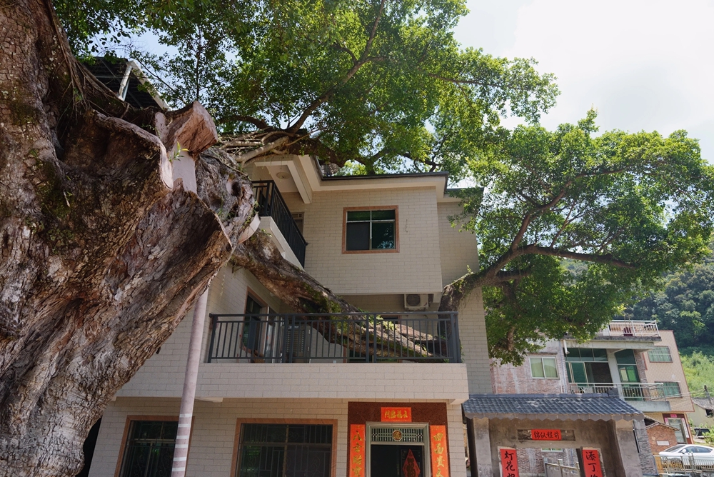 原來,村民張先生家的宅基地就在這棵榕樹邊,2019年重建新房時為了不影響古樹,對房子進行了專門設(shè)計,不惜“缺一個角”,少一個房間,只為了給千年古樹生長騰挪位置。