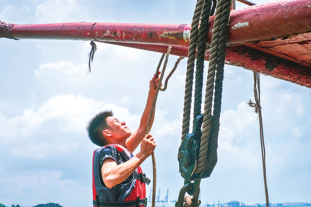 開(kāi)漁前,漁民在漁船上整理漁網(wǎng)。