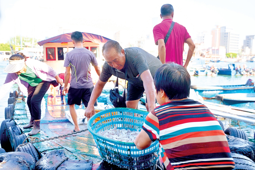 漁民在搬運(yùn)收獲的海鮮。