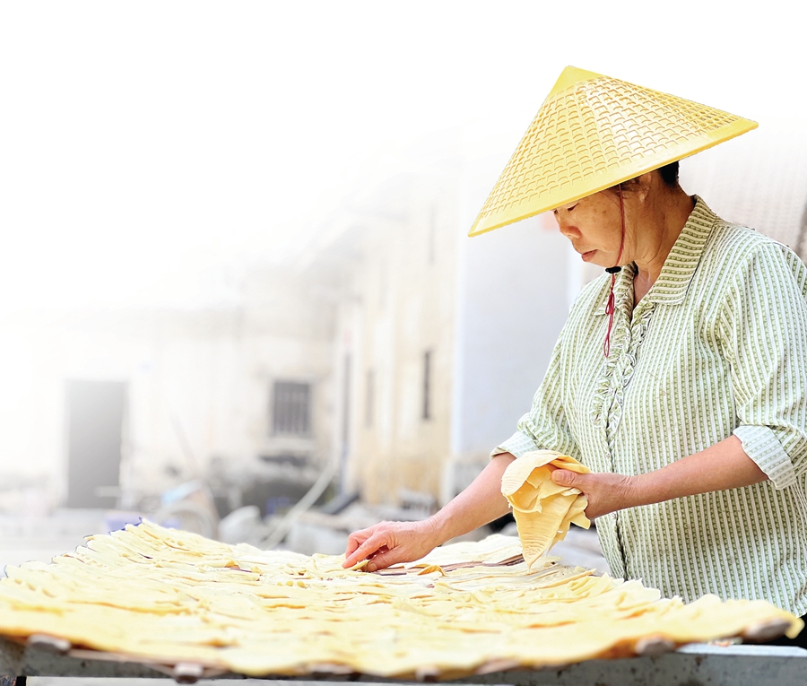 進(jìn)入新寮村,一棟棟樓房背后的竹海尤為引人注目。質(zhì)優(yōu)的甜竹多藏于其中,竹莖粗壯,最大的接近籃球的直徑。體型龐大的甜竹保證了新筍的產(chǎn)量,生長(zhǎng)10年左右的甜竹每年可產(chǎn)150~200公斤鮮筍。盛滿筍片的竹匾鋪放在新寮村的各處堂前屋頂,是村民們辛勤勞作的成果。遠(yuǎn)遠(yuǎn)望去,一片片筍干就像是一片片黃金,閃耀著致富的光,照亮著鄉(xiāng)村振興之路。