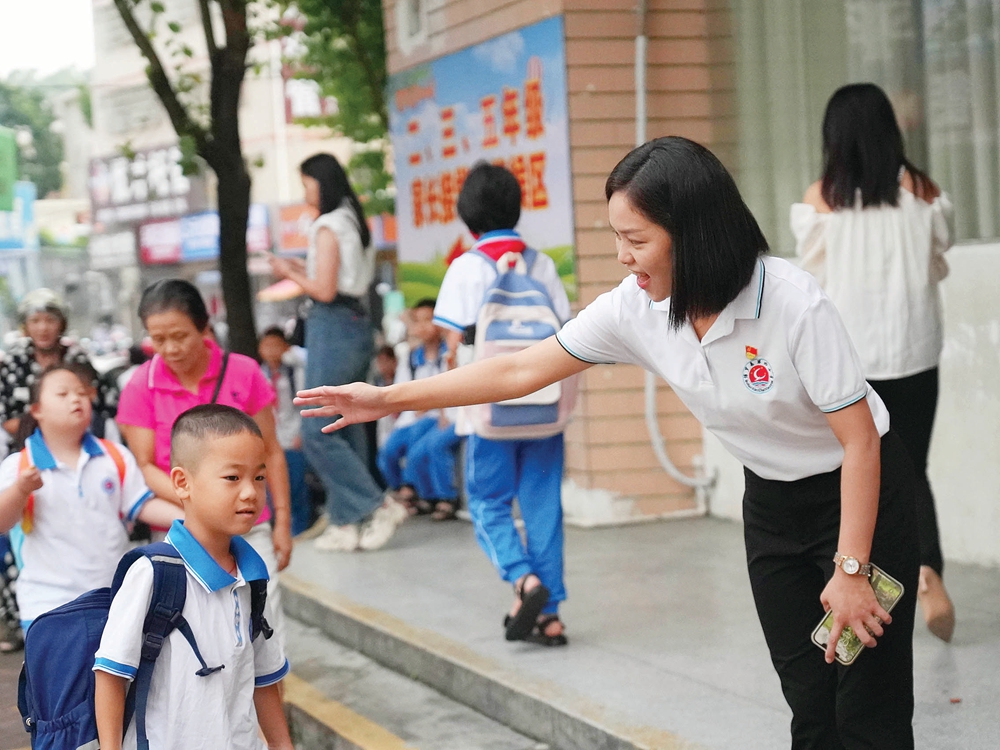 博羅縣羅陽第四小學(xué)的學(xué)生開開心心走進(jìn)校園,老師在門口熱情迎接。