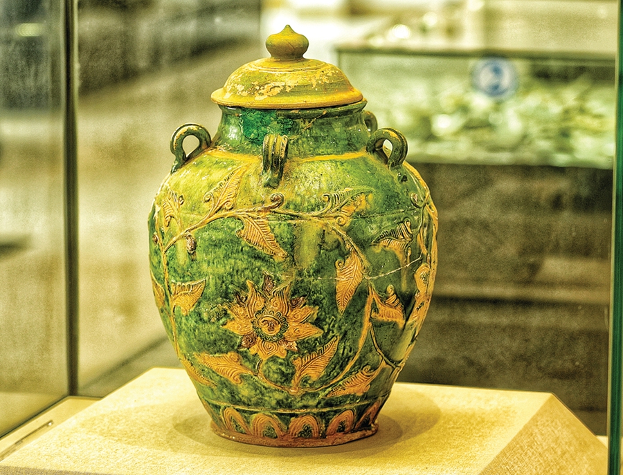 鎮(zhèn)館之寶: 元代綠釉印塑蓮瓣紋及堆塑珍珠鏈花卉紋蓋罐