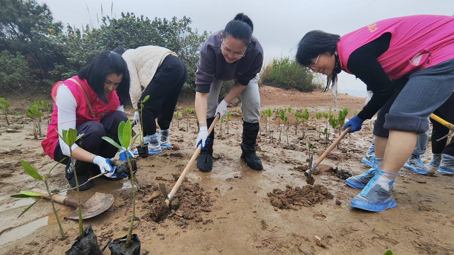 女干部職工在灘涂種紅樹。 惠州日?qǐng)?bào)記者匡湘鄂 實(shí)習(xí)生金文昊 通訊員張綺珊 攝