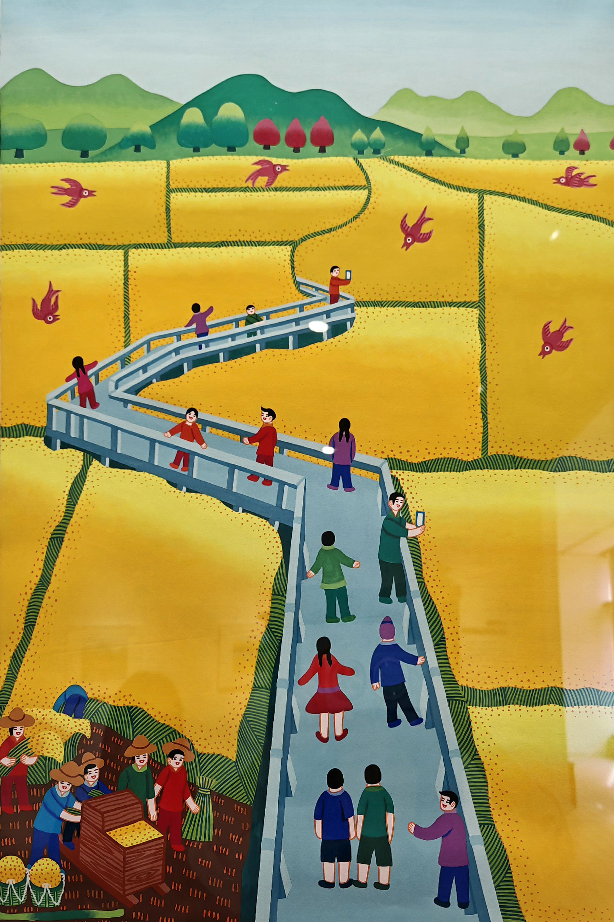畫面里,金黃的田園廣袤如毯,蜿蜒的觀景步道串聯(lián)起詩意與煙火:游人們或漫步賞景、或定格美好,在田園風光中盡享愜意;左下角的農民們忙于豐收勞作,顆粒歸倉的場景滿是農耕的踏實與溫暖。