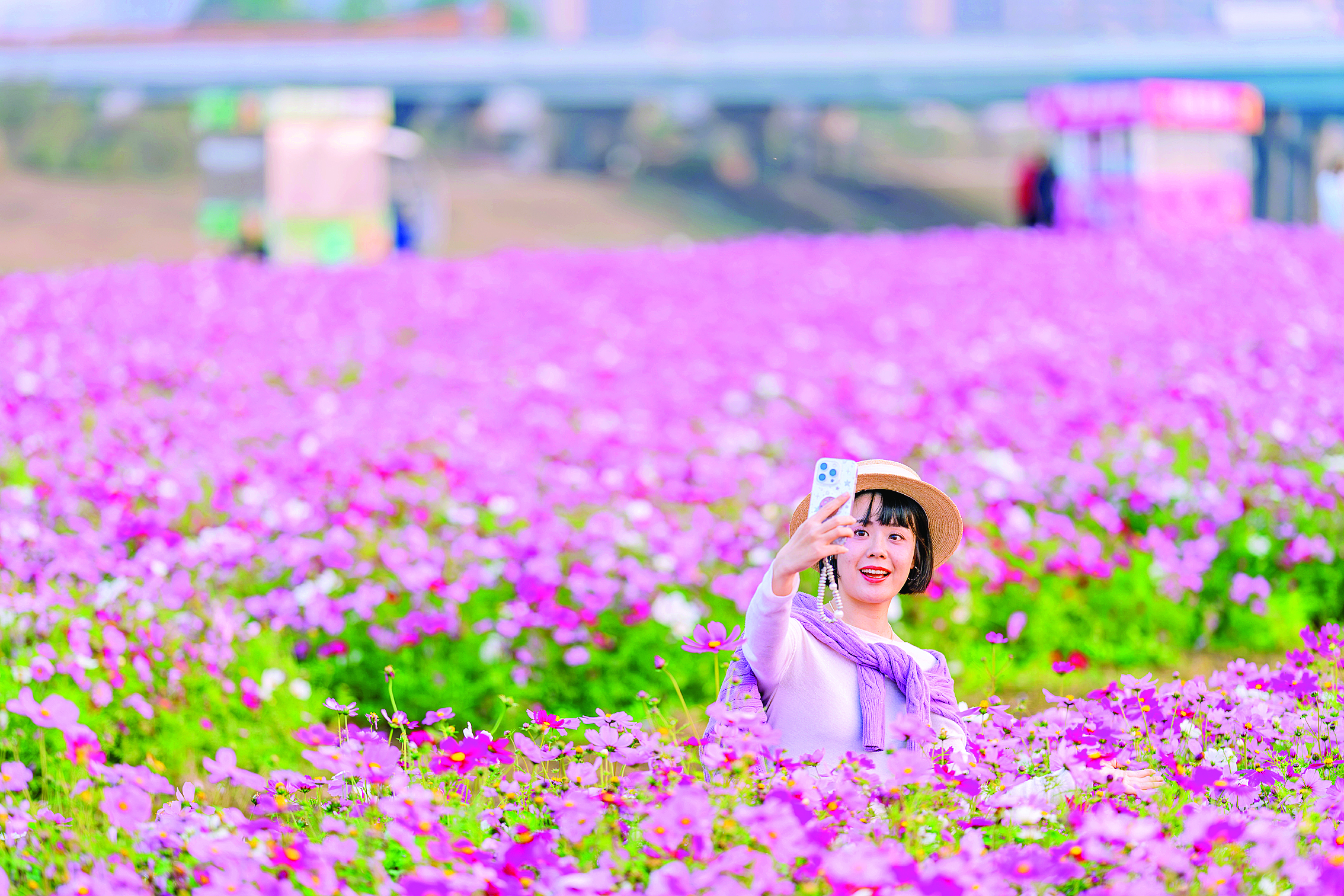 春風(fēng)拂過惠州惠城區(qū)小金河大道,各色格桑花競(jìng)相開放,接連成片的粉、白、紫、紅相間的花海,引得市民游客前往觀賞。格桑花花瓣高低錯(cuò)落,色彩繽紛,構(gòu)成一幅春意盎然的畫卷。圖為游客在格桑花海中拍照。惠州日?qǐng)?bào)記者周楠 攝